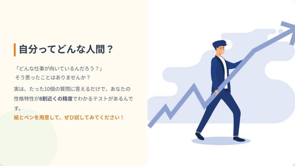 「自分ってどんな人間なんだろう?」「どんな仕事が向いているんだろう?」そう思ったことはありませんか?実は、たった10個の質問に答えるだけで、あなたの性格特性が8割近くの精度でわかるテストがあるんです。今回は、その簡単なテストをご紹介します。紙とペンを用意して、ぜひ試してみてくださいね!