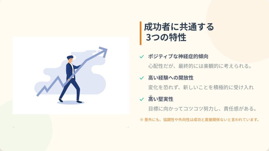 意外なことに、協調性や外向性は、成功と直接的な関係はないと言われています。