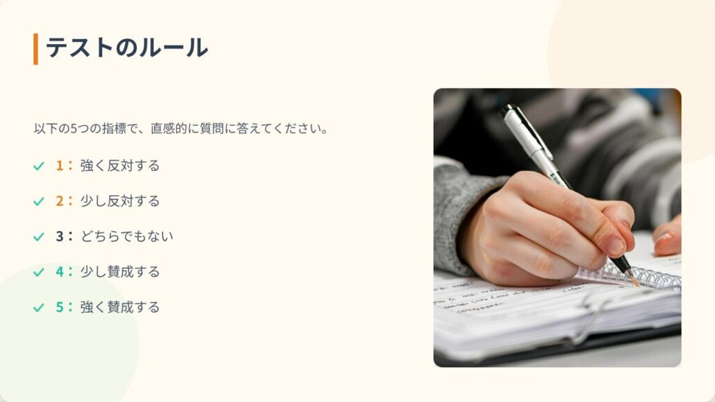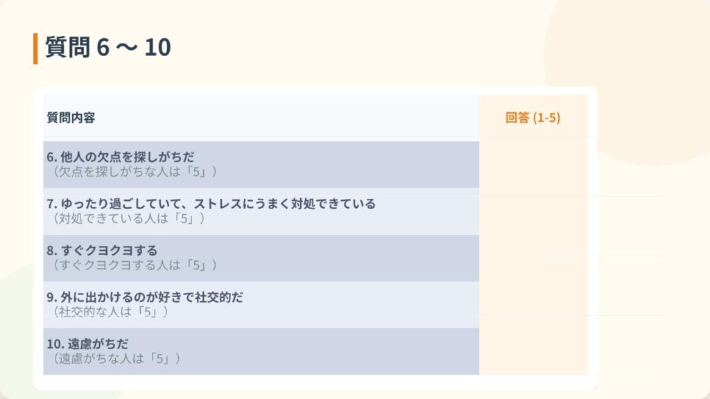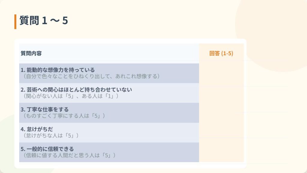 このテストでは、以下の5つの指標で質問に答えていきます。