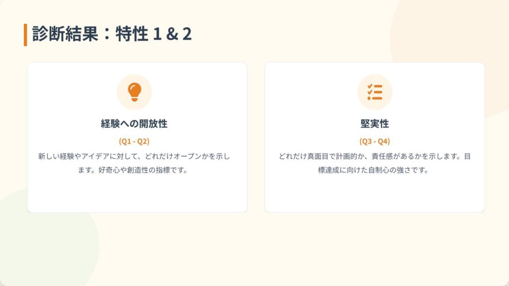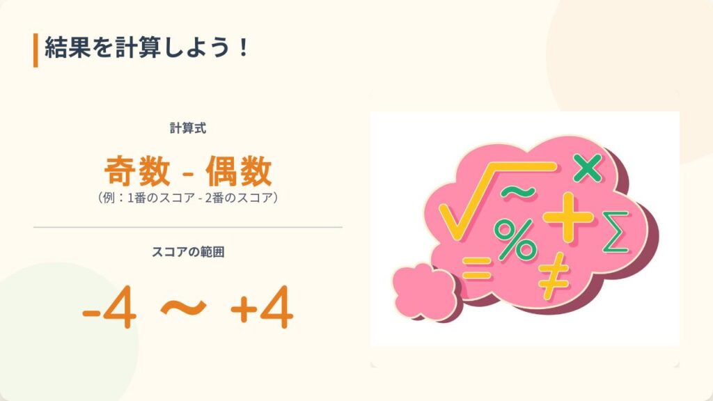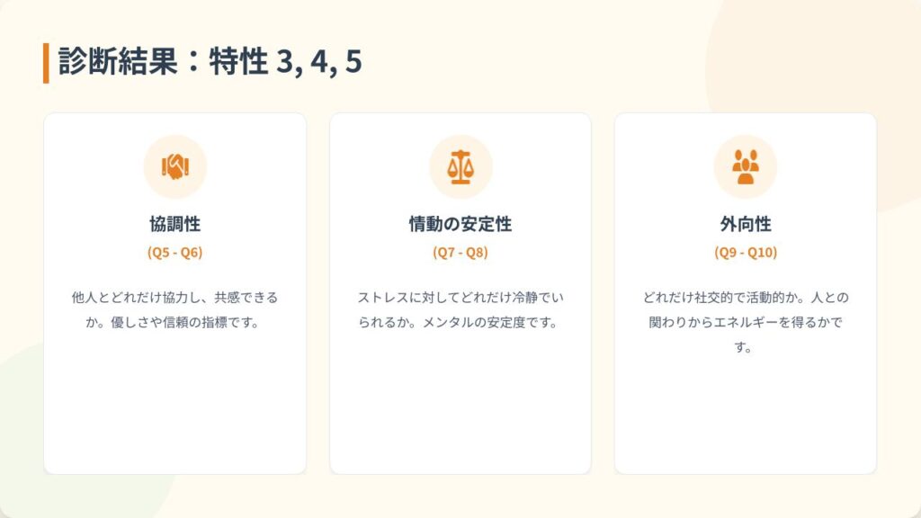 この計算で出てきた数字は、あなたの5つの主要な性格特性を示しています。スコアは-4から+4の範囲で出ます。これは「良い」「悪い」ではなく、あなたの「特性」を表すものです。