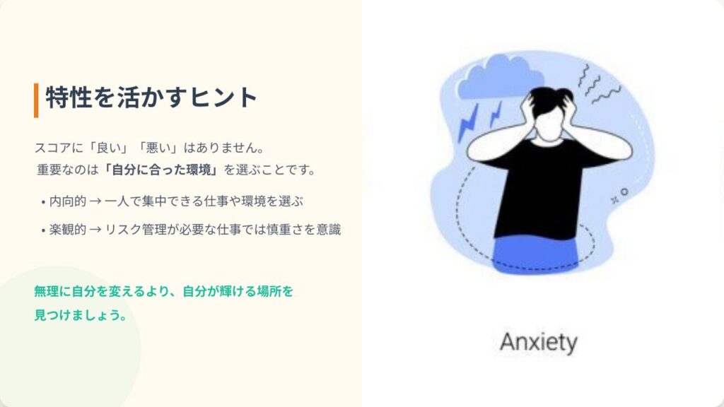 このテストで自分の特性を知ることは、今後の人生をより生きやすくするための大きなヒントになります。例えば、人前で発表するのが苦手なのに、無理にプレゼンを頑張ろうとするのは効率が悪いです。自分が一番輝ける場所や方法を見つけるために、ぜひこの結果を役立ててみてくださいね。