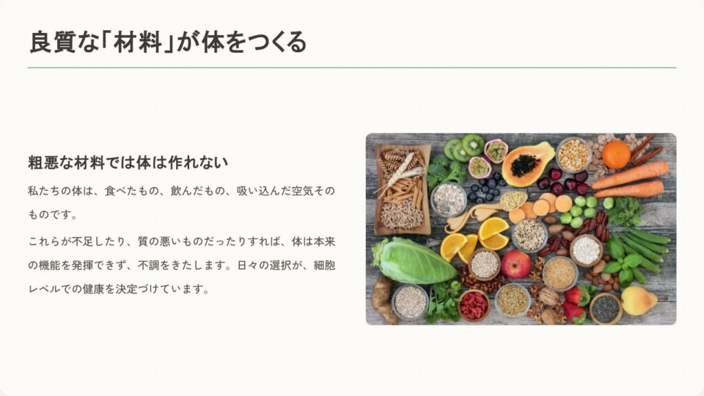柱1: 体に入れるもの — 健康の源を正しく選ぶ