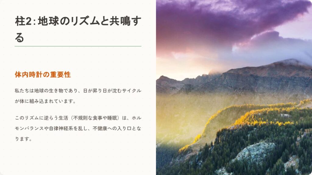 私たちの体は、この地球のリズムに合わせてプログラムされています。夜は寝る時間、日が昇っている間は活動する時間というように、生活リズムが崩れると、ホルモンバランスや自律神経系が乱れ、体調を崩しやすくなります。例えば、夜勤や不規則な食生活は、このリズムを大きく乱す要因となります。