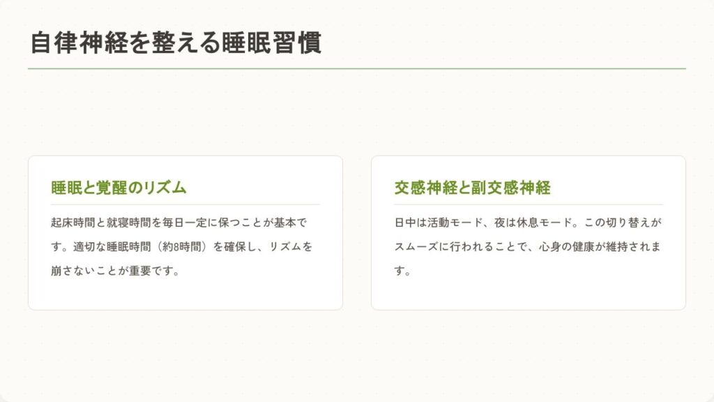 。自律神経は、明るい時間には活動モード(交感神経優位)、暗い時間には休息モード(副交感神経優位)へと切り替わるリズムを持っています。この切り替えがうまくいかないと、心身の不調につながります。