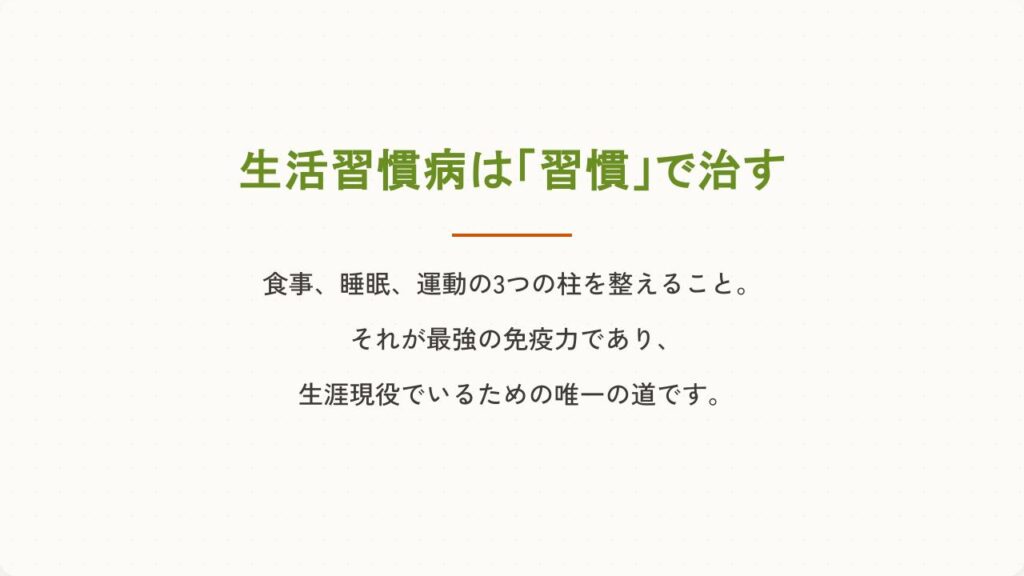 健康を本当に考える医師は、生活習慣や生活リズムの改善を促すはずです。食事習慣、睡眠習慣、運動習慣の3つが整っていれば、免疫力は高く、体はすこぶる調子が良い状態を保てるでしょう。地味に思えるかもしれませんが、これこそが健康の全てなのです。