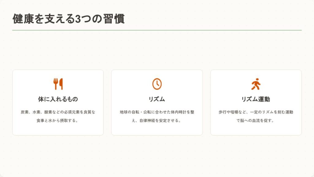 私たちの健康は、日々の選択と習慣によって大きく左右されます。特に重要なのは、「体に入れるもの」「リズム」「リズム運動」という3つの柱です。これらが健全であれば、体は本来の力を発揮し、不調とは無縁の生活を送ることができます。