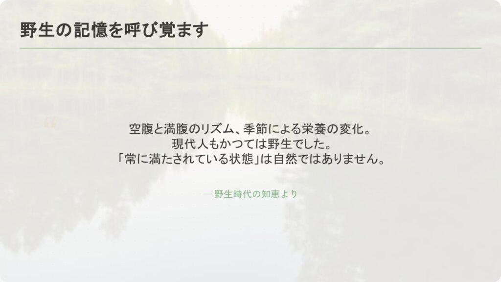 原始時代には、季節のリズムに合わせて食べ物の栄養価も変化していました。常に栄養満点というわけではなく、秋に栄養が豊富で、冬から春にかけては栄養素が少ないといった周期がありました。現代において、常に同じ栄養状態を求めることも、自然のリズムから外れていると言えるかもしれません。
