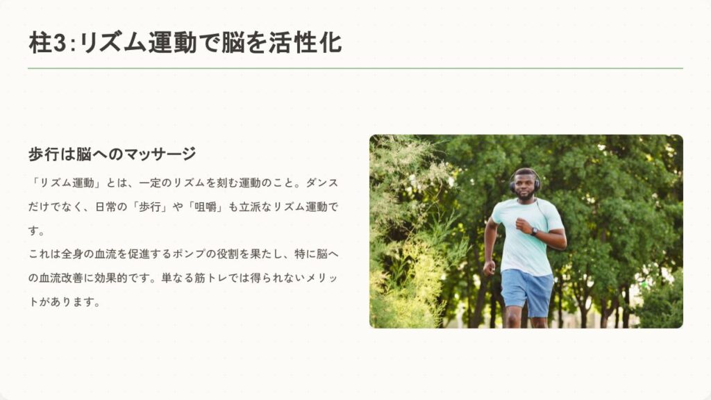健康の第三の柱は「運動」ですが、特に「リズム運動」が重要です。リズム運動とは、一定のリズムを刻む運動のことで、ダンスだけでなく、歩行や咀嚼なども含まれます。