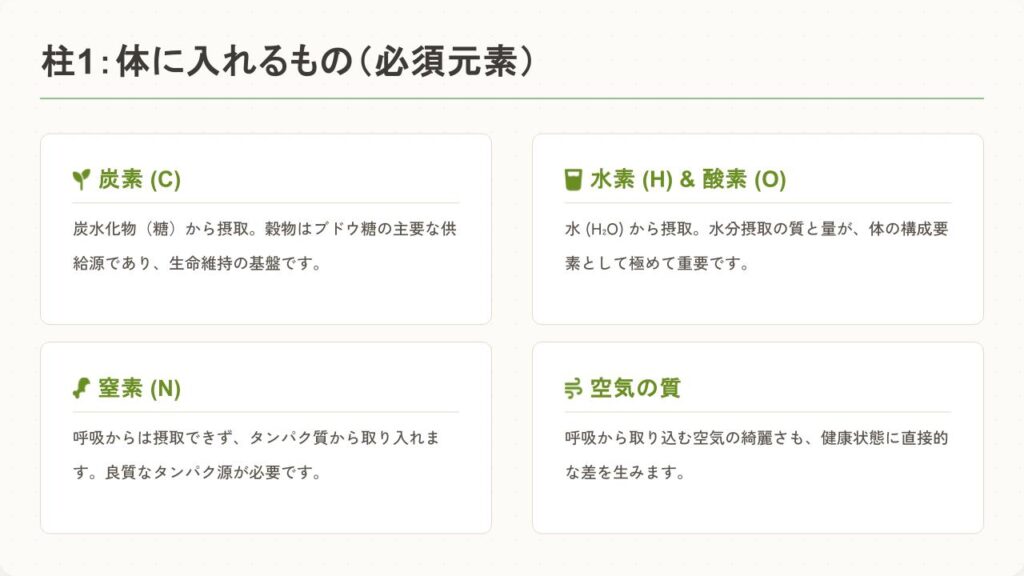 私たちの体を構成する主要な元素は、炭素(C)、水素(H)、酸素(O)です。これらは「炭素生物」である私たちにとって不可欠であり、炭水化物(糖)や水から摂取されます。特に、炭水化物の主要な構成要素であるブドウ糖は穀物から得られるため、穀物を適切に摂取することは生命維持に直結します。また、水素と酸素からできる水は、炭素と同じくらい重要であり、十分な水分摂取と水の質が健康に大きく影響します。