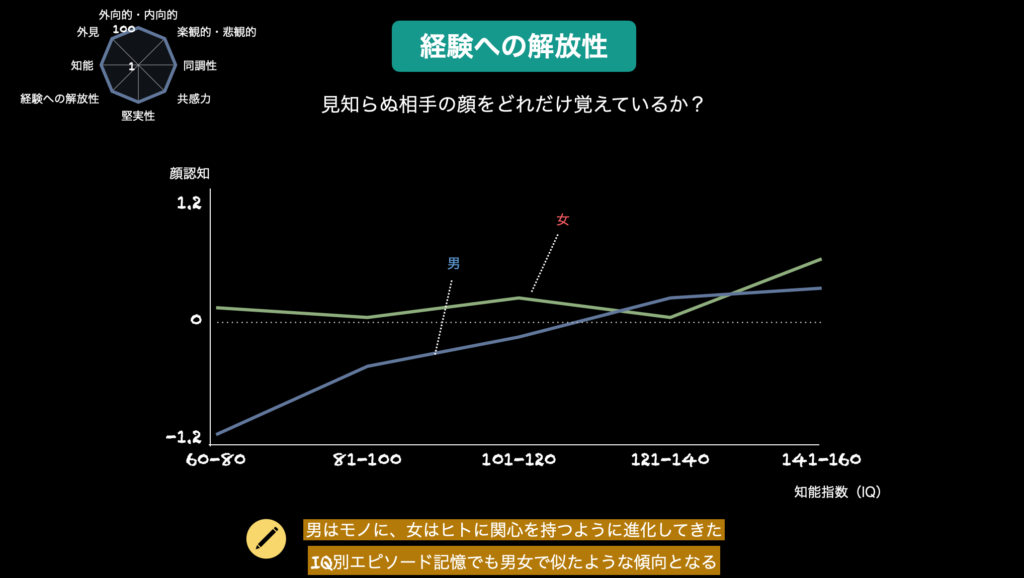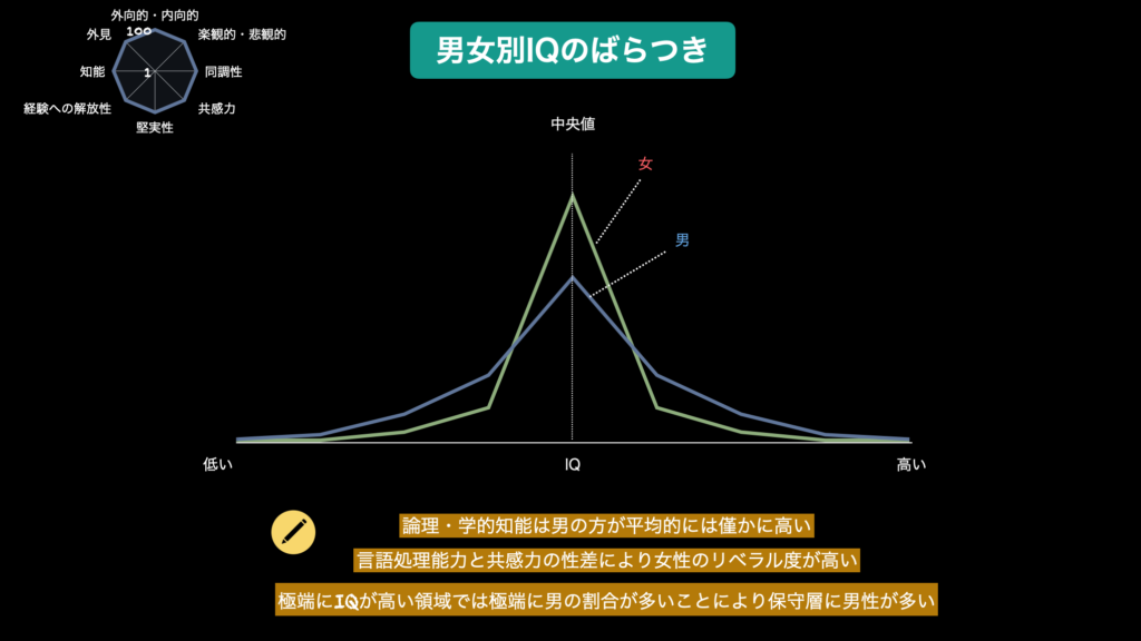 IQ(知能指数)にも男女差が見られます。男性は非常に高い「天才」と、非常に低い「バカ」の両極端に分かれる傾向があるのに対し、女性は平均的なIQの人が多いという統計があります。論理的な思考力や学力的な知能は男性がわずかに高いと言われますが、言語処理能力や共感力は女性が非常に高いです。