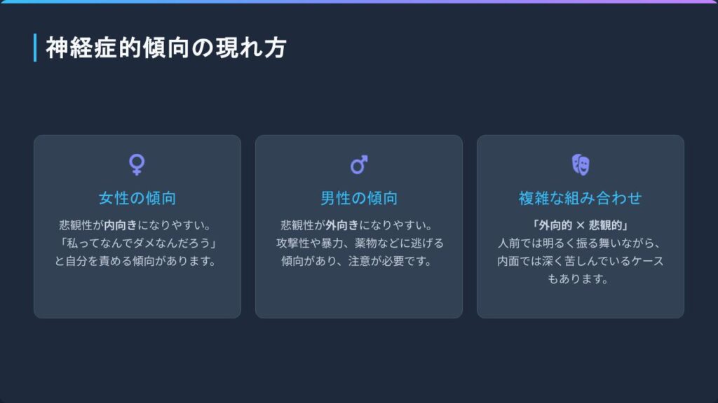 悲観性が深まった場合、その現れ方には性別による傾向があります。女性の場合は悲観性が内向きになり、「私ってなんでダメなんだろう」と自分を責める傾向があります。一方、男性の場合は悲観性が外向きになり、暴力や攻撃性、薬物などに逃げる傾向があるため、自殺者の数は男性の方が多いとされています。