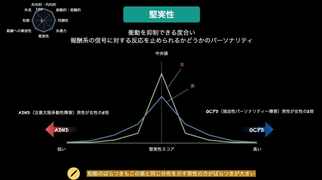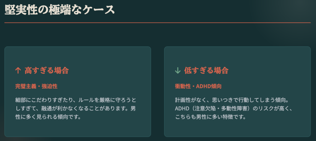 堅実性が高すぎると、完璧主義や強迫性パーソナリティ障害の傾向が見られることがあります。これは男性に多く見られます。逆に、堅実性が低すぎると、衝動性が高く、ADHD(注意欠陥・多動性障害)の傾向が見られることがあります。こちらも男性に多く、女性の5倍も多いとされています。
