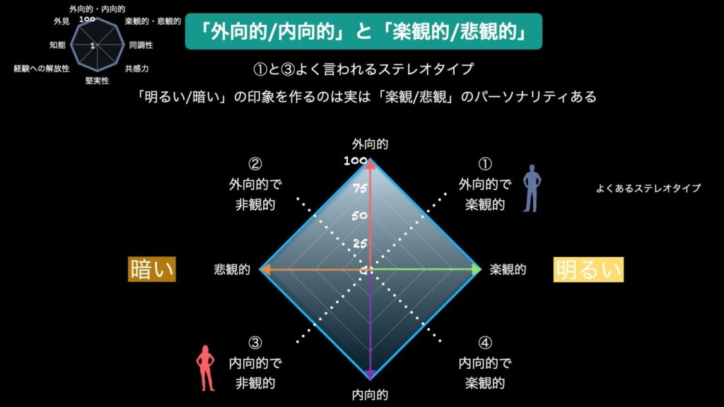 「明るい人=楽観的で外向的」というイメージがありますが、実際には様々な組み合わせがあります。例えば、悲観的でありながら外向的な人も存在します。このような人は、人前では明るく振る舞いながらも、内面では苦しんでおり、うつ病や自殺に至るケースもあるため、見た目だけで判断することはできません。