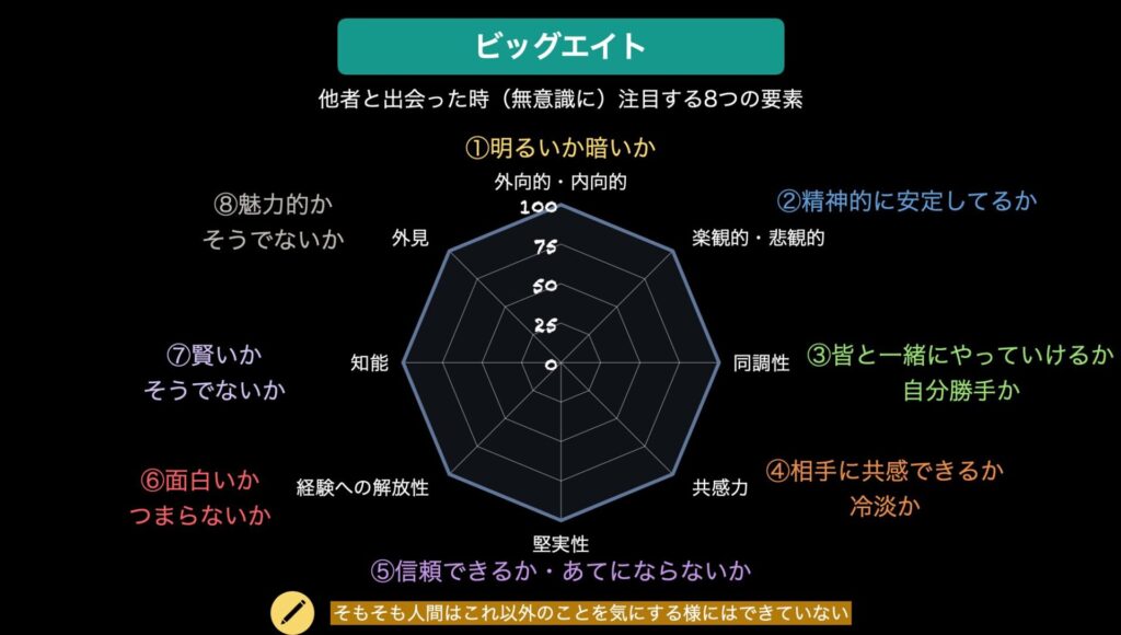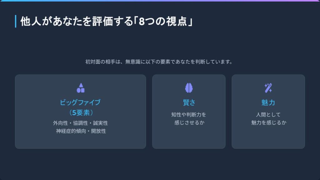 人は初めて会う相手を評価する際、無意識のうちに8つの観点から判断しています。これはビッグファイブの5つの要素に加えて、「賢さ」と「魅力的かどうか」という2つの要素(これは世間一般の美醜ではなく、あなたがその人を魅力的だと感じるかどうか)が加わったものです。この8つの要素を意識することで、相手からの信用を得たり、「賢い人だ」「協調性がある人だ」といった良い印象を与えることができます。