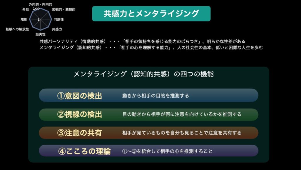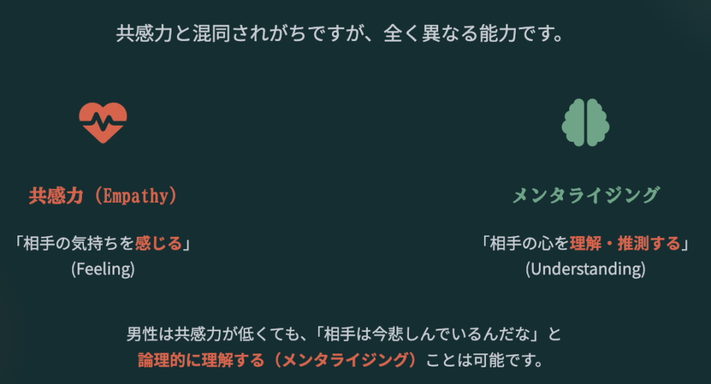 共感力と混同されがちですが、もう一つ重要な能力に「メンタライジング」があります。共感力が「相手の気持ちを感じる能力」であるのに対し、メンタライジングは「相手の心を理解する能力」です。例えば、男性は相手の気持ちを感じることは苦手でも、「相手が悲しんでいるんだな」と理解することはできます。この理解する能力が低いと、相手の行動の意図が分からず、社会的な疎外感やいじめにつながることもあります。