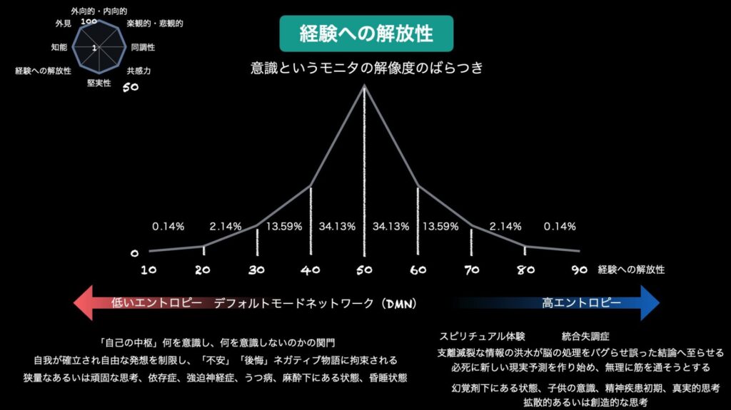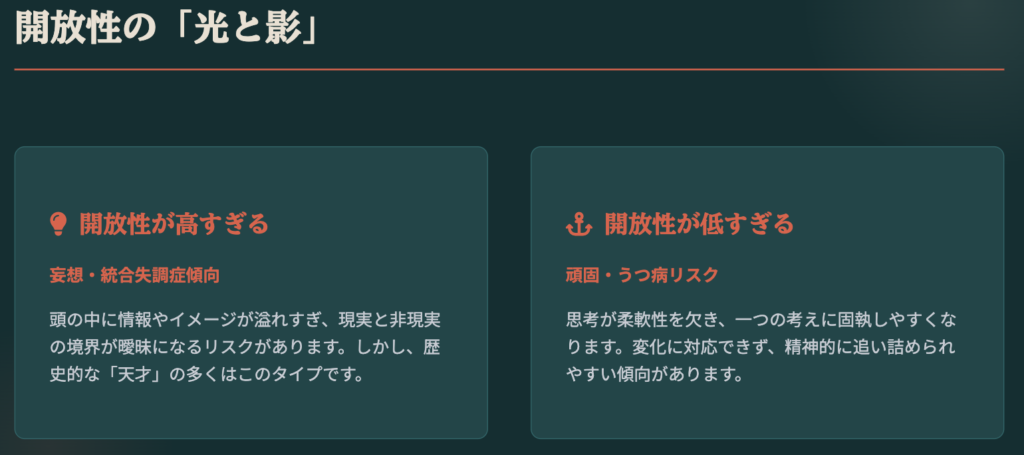 経験への開放性が低すぎると、思考が頑固になり、依存症やうつ病のリスクが高まります。逆に、高すぎると、頭の中に様々な情報が溢れ、妄想や統合失調症につながることもあります。しかし、この高い開放性を持つ人の中には、非常に独創的な発想をする「天才」も含まれます。