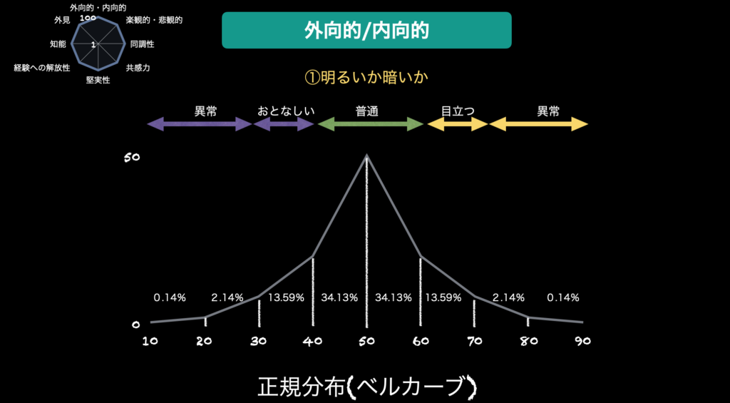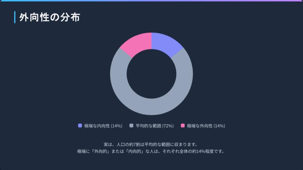人口の約7割は平均的な外向性・内向性の範囲に収まります。非常に目立つ「外向的な人」や、非常に大人しい「内向的な人」はそれぞれ約14%程度存在し、極端なタイプはごく少数です。
