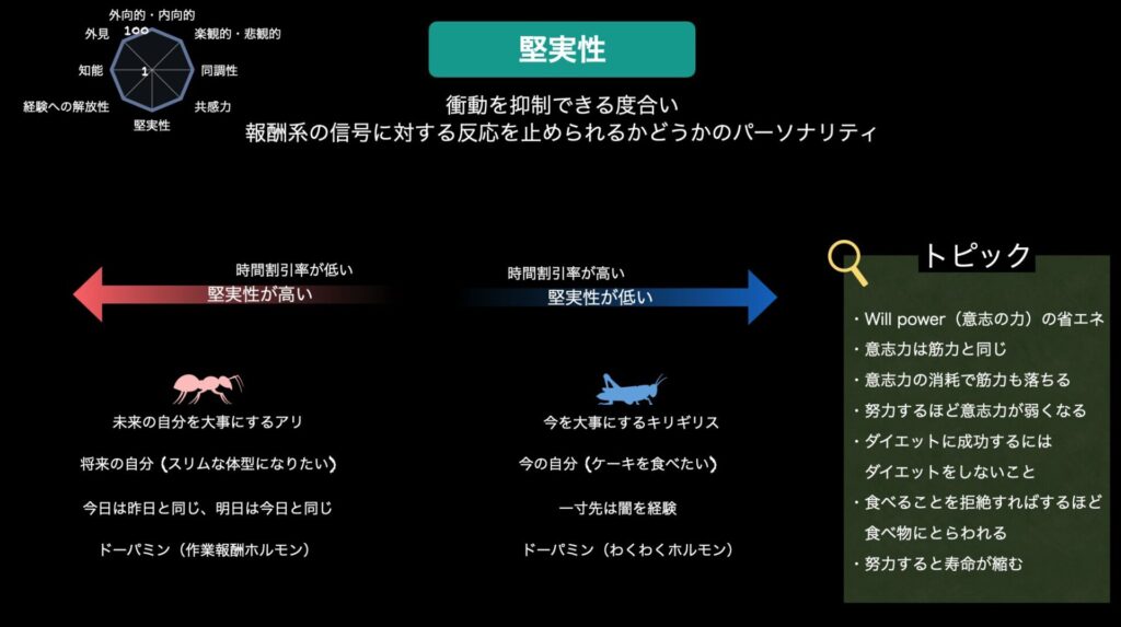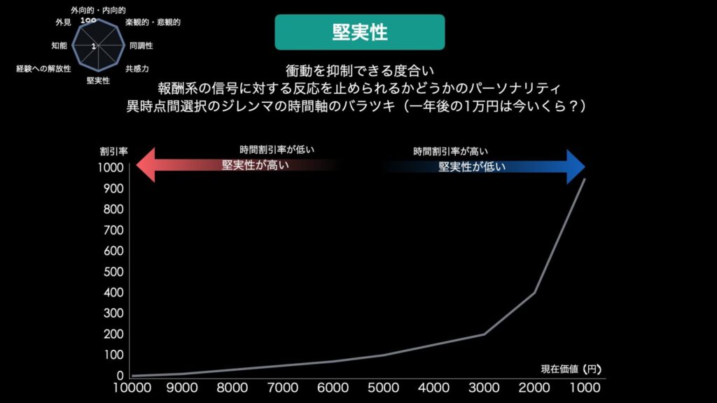 「堅実性」とは、衝動を抑制し、将来のために努力できる能力のことです。例えば、「今すぐ1000円もらう」のと「1年後に1万円もらう」のであれば、堅実性が高い人は後者を選びます。これは「時間割引率」とも呼ばれ、将来の利益を重視する傾向があることを示します。女性はこの堅実性が中央値に集中しているのに対し、男性は非常に高い人もいれば、非常に低い人もいるというように、ばらつきが大きいのが特徴です。