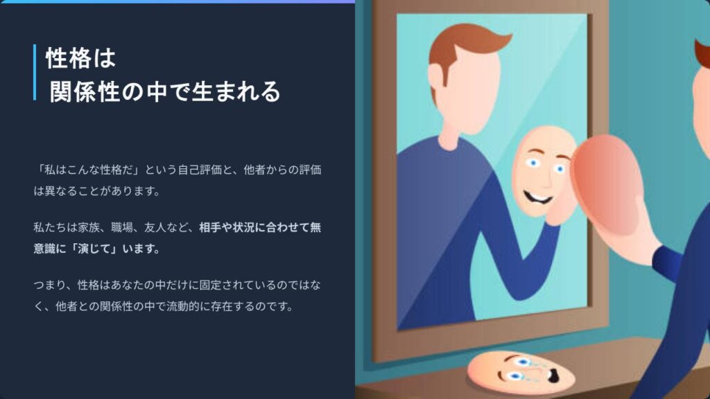 私たちは、状況に応じて無意識のうちに「演じて」います。例えば、家族といる時、職場にいる時、友人といる時では、それぞれ振る舞いや言葉遣いが変わるはずです。これは、その場その場で異なるキャラクターを演じているからに他なりません。つまり、あなたの性格は、あなた自身の中にあるのではなく、他者との関係性の中で生まれるものなのです。