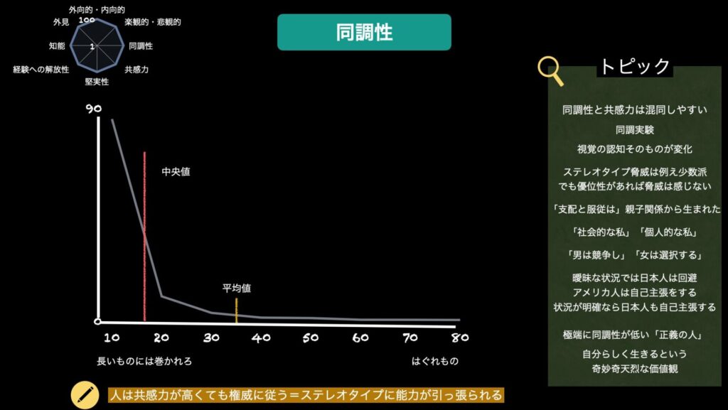 同調性は「ロングテール」と呼ばれる分布を示します。つまり、ほとんどの人が高い同調性を持っており、同調性が低い人はごく少数しかいません。これは、平均値よりも中央値を見ることで、より正確な実態が分かります。