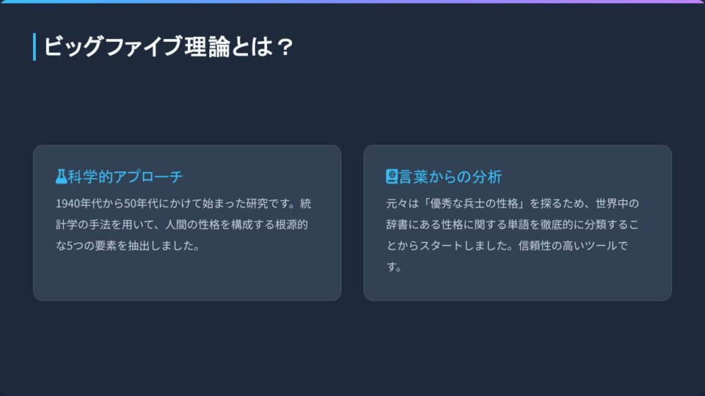 ビッグファイブ理論とは、統計学の手法を使って、人間の性格を構成する根源的な5つの要素を抽出したものです。この研究は1940年代から50年代にかけて始まり、元々は「兵士として最も優秀な性格とは何か」を探る目的で、世界中の辞書にある性格に関する単語を徹底的に分類することからスタートしました。その歴史の長さと研究規模の大きさから、非常に信頼性が高く、実用的な性格分析ツールとして知られています。