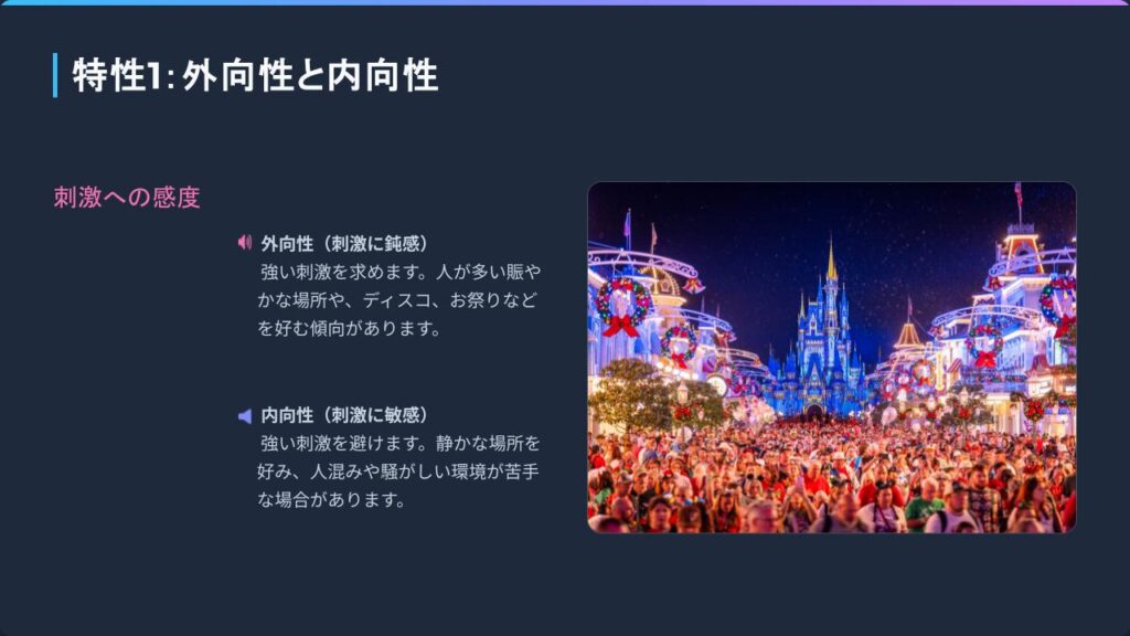刺激に対して鈍感なタイプです。強い刺激を求める傾向があり、ディスコやクラブ、お祭りなど、人が多く集まる賑やかな場所を好みます。