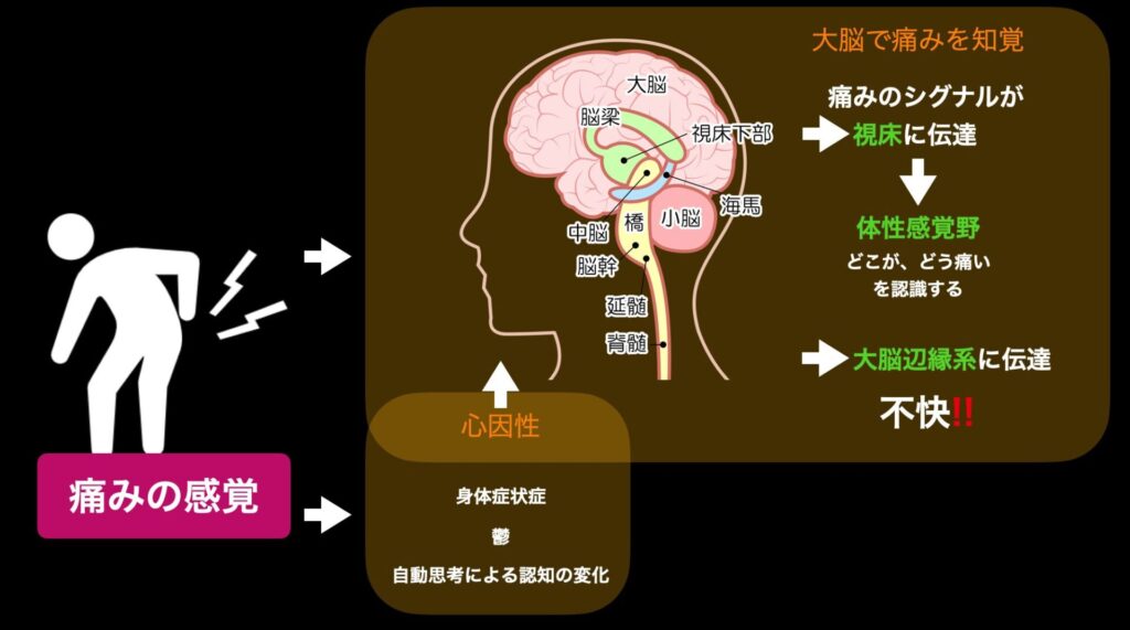 痛みは、物理的な情報(どこが痛いか)と「不快感」という感情が合わさって成立します。痛いというシグナルが