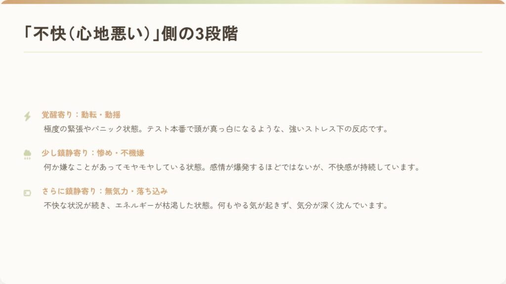 さらに鎮静寄り:無気力、落ち込み。不快な状況が続き、何もやる気が起きない、気分が沈んでいる状態です。