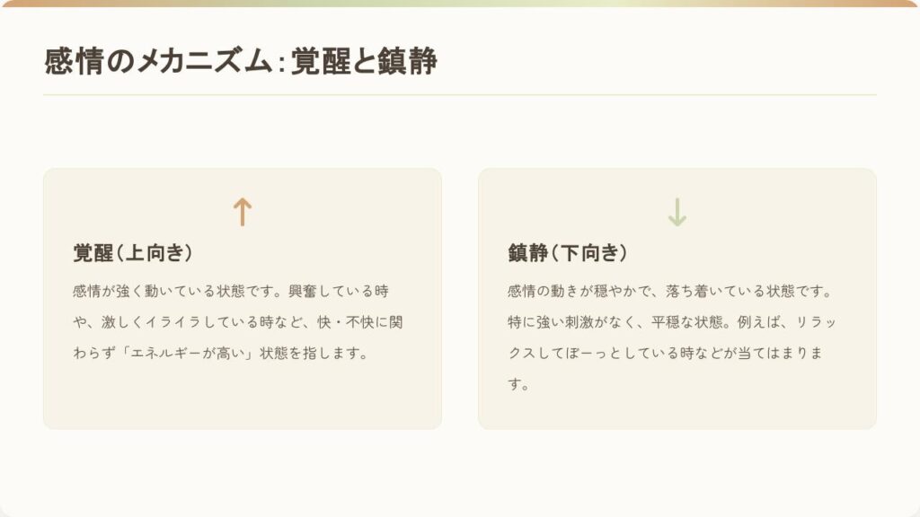 感情には、「覚醒」と「鎮静」という上下の軸があります。