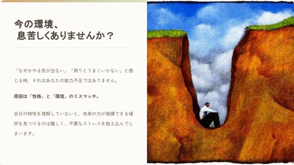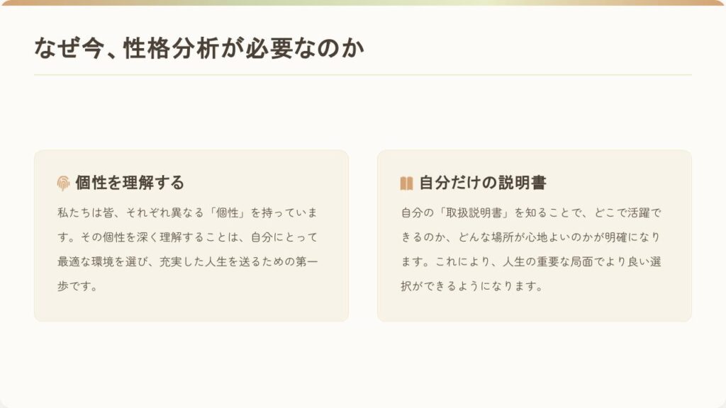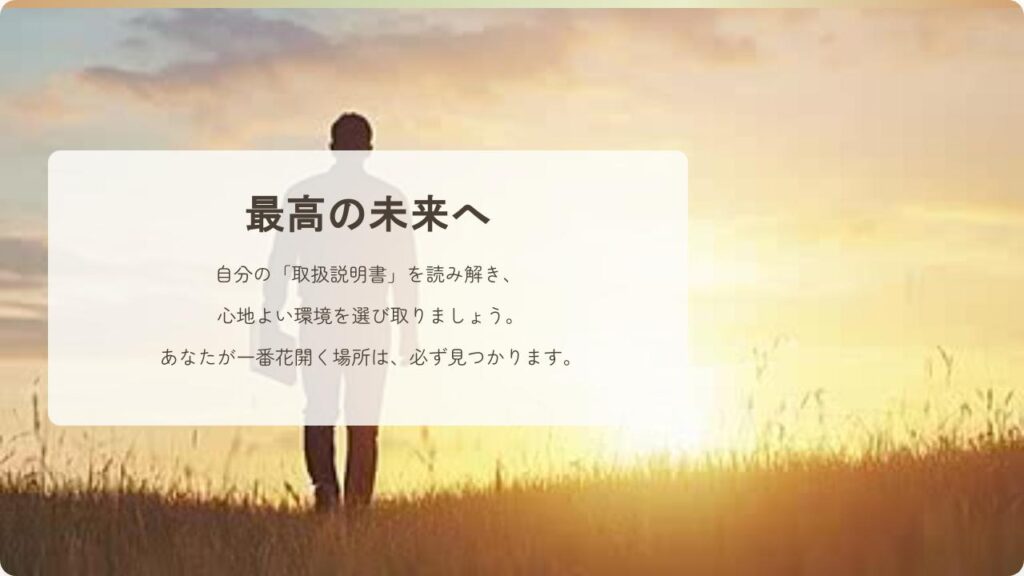 私たちは皆、それぞれ異なる個性を持っています。その個性を理解することは、自分にとって最適な環境を選び、充実した人生を送るための第一歩です。自分の「取扱説明書」を知ることで、どこで活躍できるのか、どんな場所が心地よいのかが明確になり、より良い選択ができるようになります。