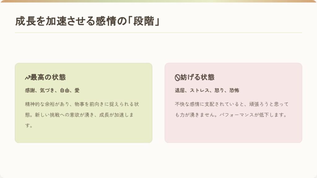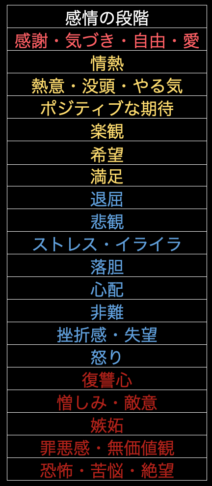 感情には、さらに「段階」があります。上に行けば行くほど精神的な余裕があり、成長を促すポジティブな状態です。