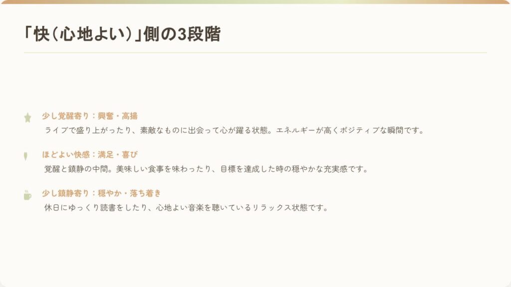 ほどよい快感(覚醒と鎮静の間):満足、喜び。例えば、美味しい食事をゆっくり味わっている時や、目標を達成した時の穏やかな達成感などです。
