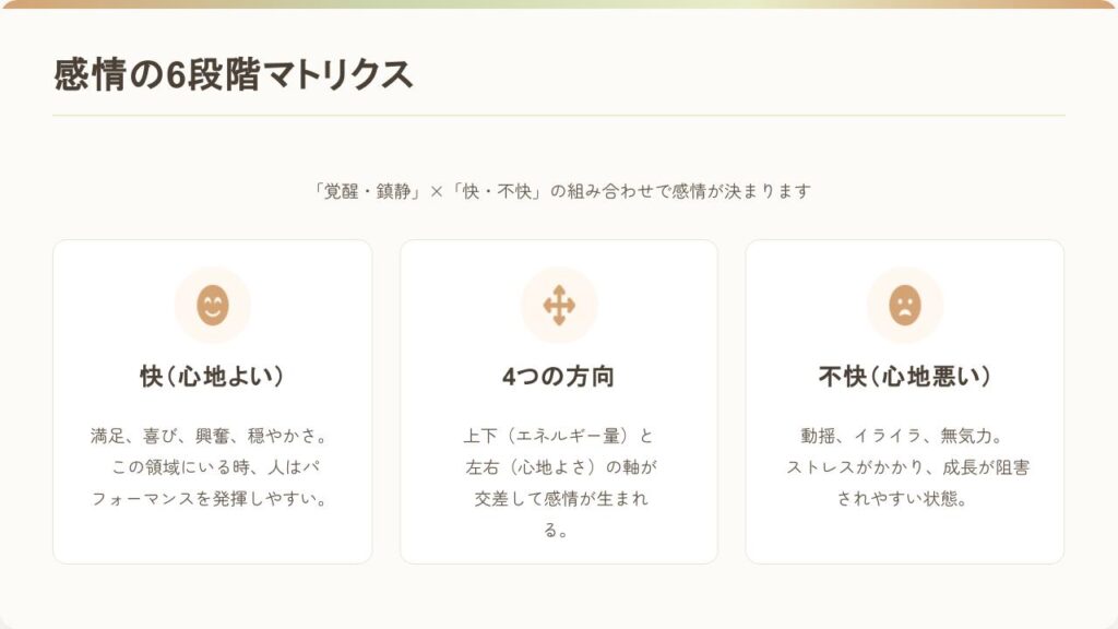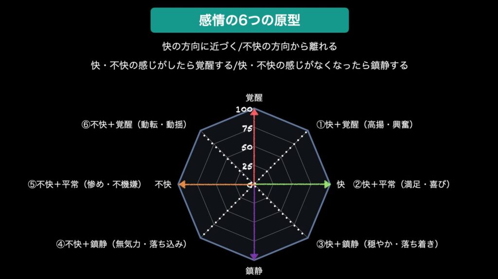 覚醒と鎮静の軸に加えて、感情には「快(心地よい)」と「不快(心地悪い)」という左右の軸があります。この上下(覚醒・鎮静)と左右(快・不快)の4つの方向を組み合わせることで、私たちの様々な感情が生まれるマトリクスが形成されます。