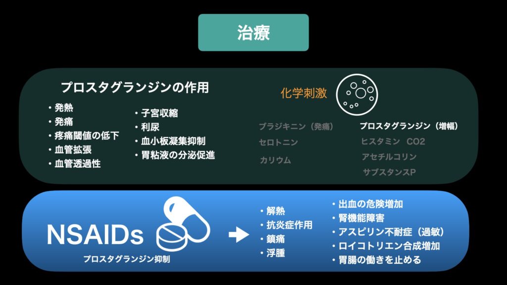 • 胃腸障害: 胃粘液の分泌が抑制され、胃の粘膜が荒れやすくなります。