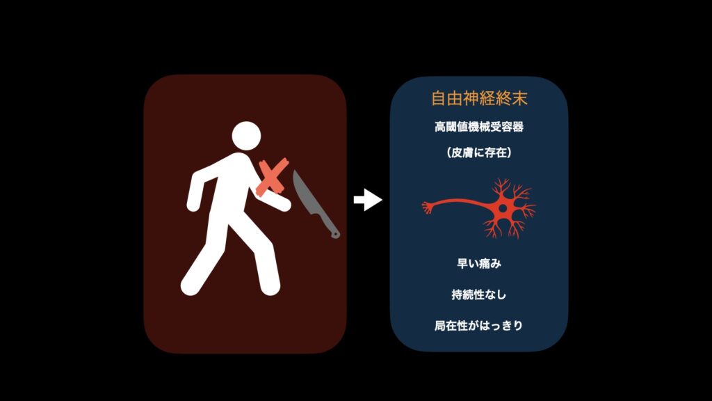 • 早い痛み: 鋭く、すぐに感じられる痛みで、刺激の場所がはっきり分かります。例えば、指を切った瞬間の痛みなどがこれにあたります。