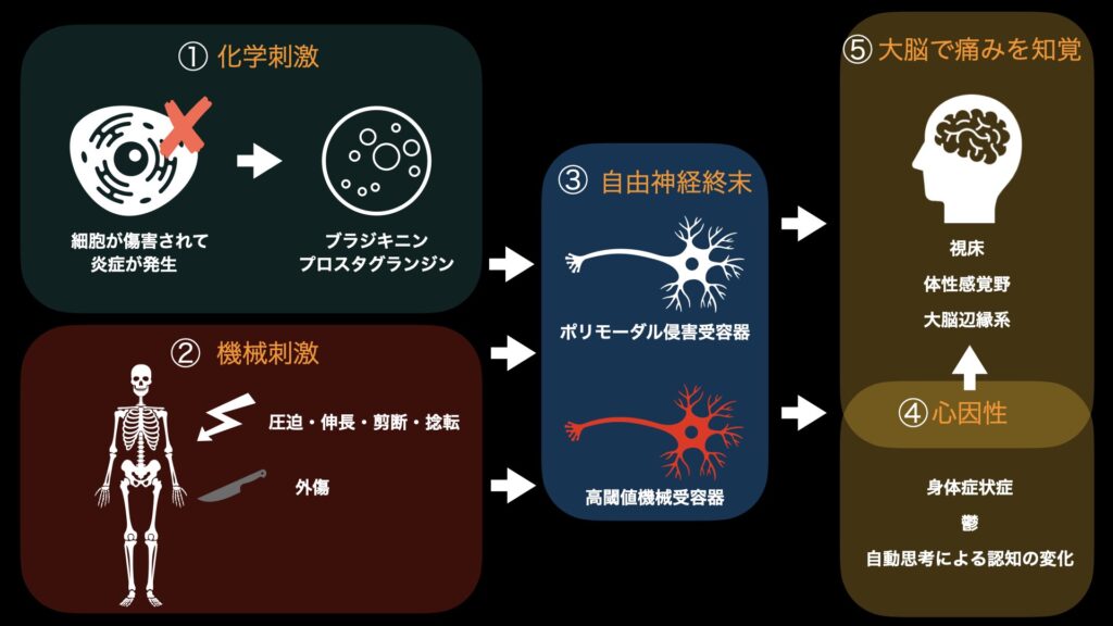 私たちの体が痛みを感じるプロセスは、大きく分けて以下の4段階で進行します。