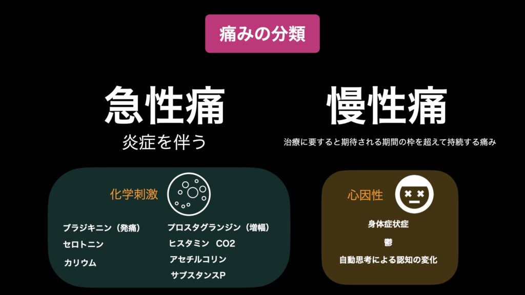 痛みは、その性質や持続期間によって様々な種類に分類されます。これらの分類を理解することは、適切な対処法を見つける上で非常に重要です。