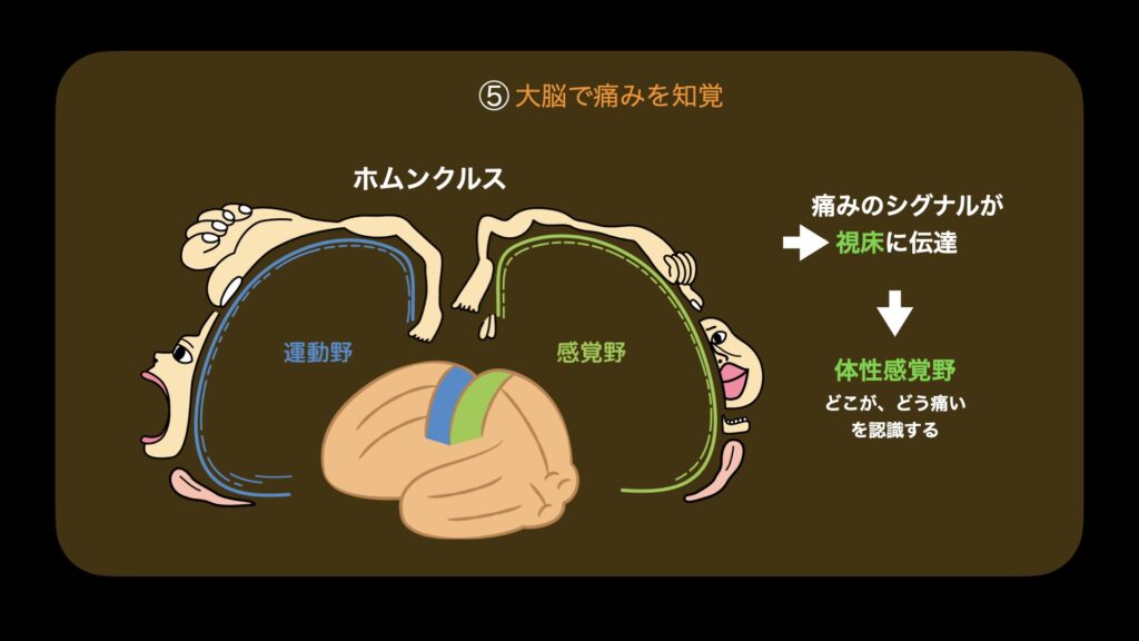 視床: 痛みの信号が最初に到達する脳の領域で、ここで大まかな痛みの感覚が認識されます。