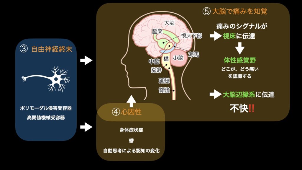 • 遅い痛み: 鈍く、じわじわと広がるような痛みで、持続性があります。刺激の場所が特定しにくいことがあります。