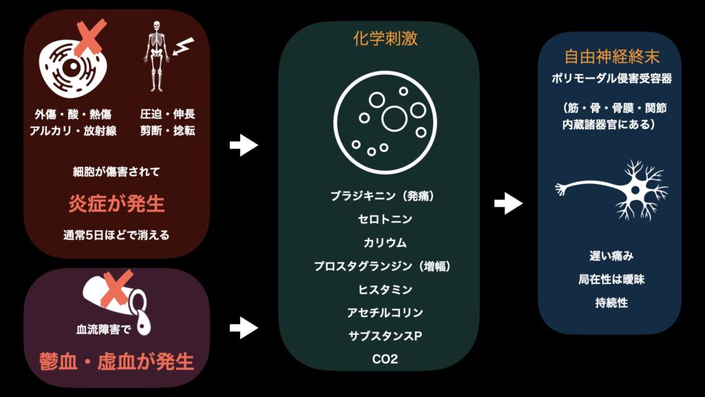 組織が損傷した際に放出される特定の化学物質(発痛物質)による刺激です。炎症反応や細胞の破壊によって生じる痛みは、この化学物質が自由神経終末に作用することで発生します。