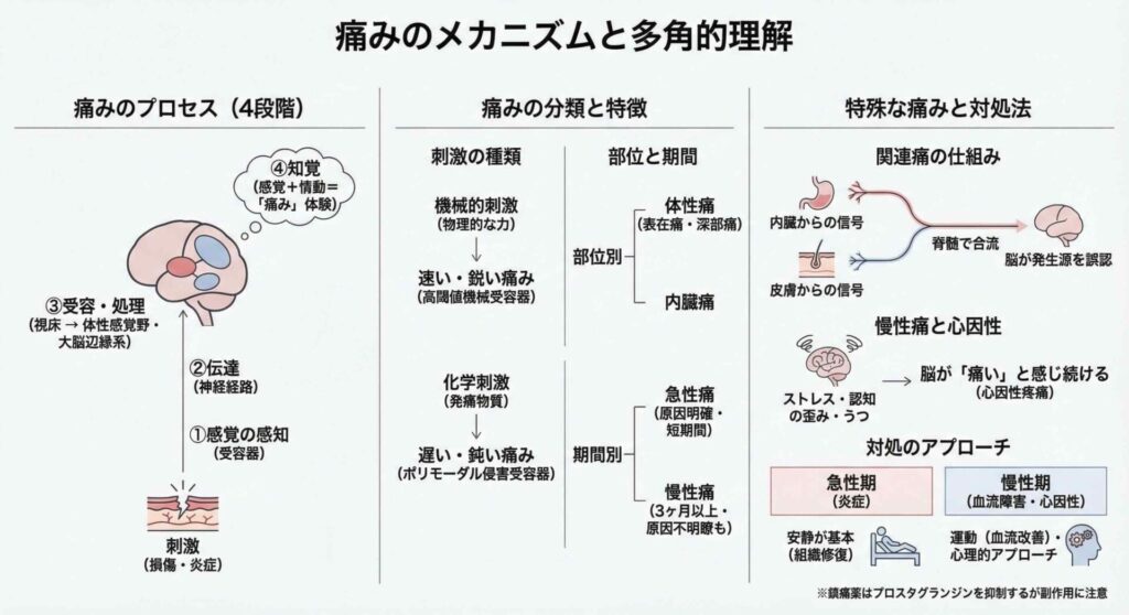 私たちは日々の生活の中で、様々な痛みに直面します。腰の痛み、肩の凝り、頭痛、生理痛…。痛みは私たちの行動を制限し、気分を落ち込ませ、生活の質を著しく低下させることがあります。しかし、その痛みが一体どこから来て、どのようにして感じられているのか、そしてどうすれば適切に対処できるのか、深く理解している人は少ないかもしれません。